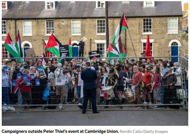 Firma Palantir psychopata Thiela je využívaná aj Izraelom na boj proti Palestíncom. Práve z tohto dôvodu sa viacerí podporcovia Palestíny dostali na jeho prednášku a obvinili ho zo spoluúčasti na genocíde Palestíncov, kde doteraz zabili vyše 14 000 detí (7/2024). Protestujúci na neho kričali, že jeho technológia je zodpovedná za bombardovanie nemocníc. Ďalší protestujúci sa vyjadril, že je úbohe, keď niekto zarába milióny na smrti.