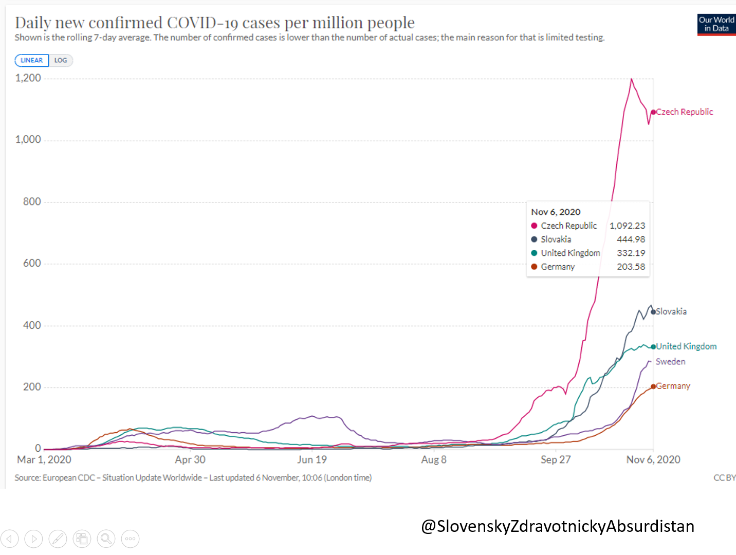 Na dnešnej TB (6.11.20) s ministrom zdravotníctva a premiérom znovu odzneli zavádzajúce závery, že celoplošné testovanie jednoznačne spomalilo šírenie infekcie. Z uvedeného grafu je na prvý pohľad zrejmé, že krivka má stále stúpajúci trend. Je to zrejme spôsobené aj narastajúcou incidenciou pozitívnych prípadov vo vyšších vekových skupinách, na čo poukázal aj minister zdravotníctva. Z uvedených 4 krajín by sa o výraznejšom poklese dalo hovoriť iba v prípade Českej republiky. Ako je známe, táto krajina napriek trojnásobne vyššiemu počtu infikovaných ako má SR, odmietla celoplošné testovanie celej krajiny. Za povšimnutie stojí aj relatívne miernejší priebeh „druhej“ vlny vo Švédsku v porovnaní zo SR, UK a ČR.