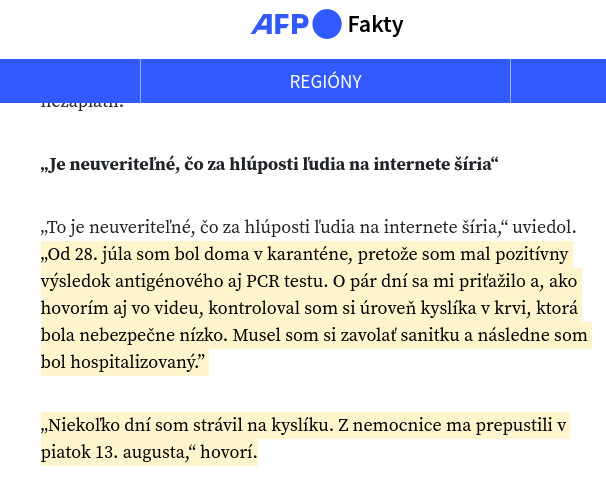 O tom, že pacient bol na kyslíku píše aj AFP: