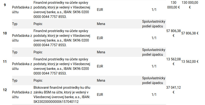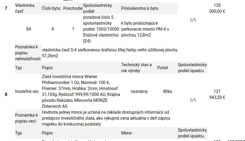 80 minci čistého zlata, apartman v Pagu (Chorvátsko), auto, skúter BMW, rôzné nehnuteľnosti – súpisová hodnota cez 1 000 000 EUR.