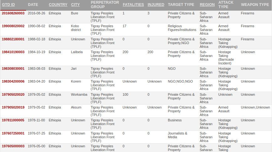 Skupina TPLF sa sformovala okolo roku 1975, za teroristické aktivity a incidenty od roku 1976 do roku 1990 je klasifikovaná ako teroristická. Moc získavala typickými teroristickými aktivitami, výbuchy, bomby, vraždy, únosy, vydieranie, zastrašovanie. Práve zastrašovanie Tedrosovi išlo krásne počas propagácie vakcín od svojich sponzorov v obdobii COVID-19. Tedros patril medzi 3 najvyššie postavených členov teroristickej organizácie TFLP, takže sa musel podieľať na organizovaní teroristických akcií. Namiesto vo vedeni WHO by mal sedieť v base.