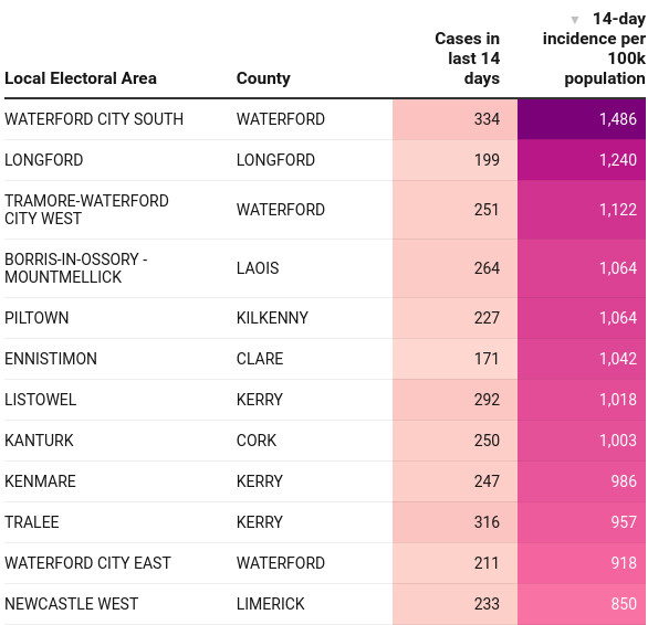 Mesto Waterford v má najvyšiu zaočkovanosť v Írsku – 99,7% a súčasne je tam najvyšší výskyt kovidu 1486/100.000 obyvateľov (južná volebná časť – 14-denná incidencia), kým národný priemer je 493/100.000 obyvatelov.