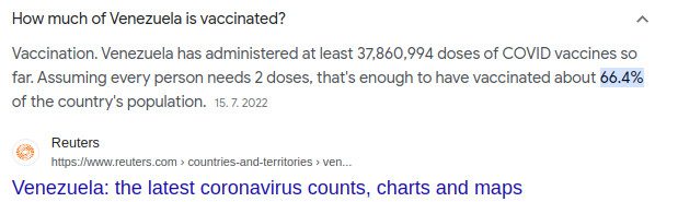 Niekto by si povedal, že chudobná krajina Venezuela, kde cena vakcíny je vyššia ako živobytie na niekoľko dni, nebude tak zaočkovaná. Opak je pravdou. Vo Venezuele je zaočkovaných vyše 66% obyvateľov. Pre porovnanie na Slovensku je okolo 45%.