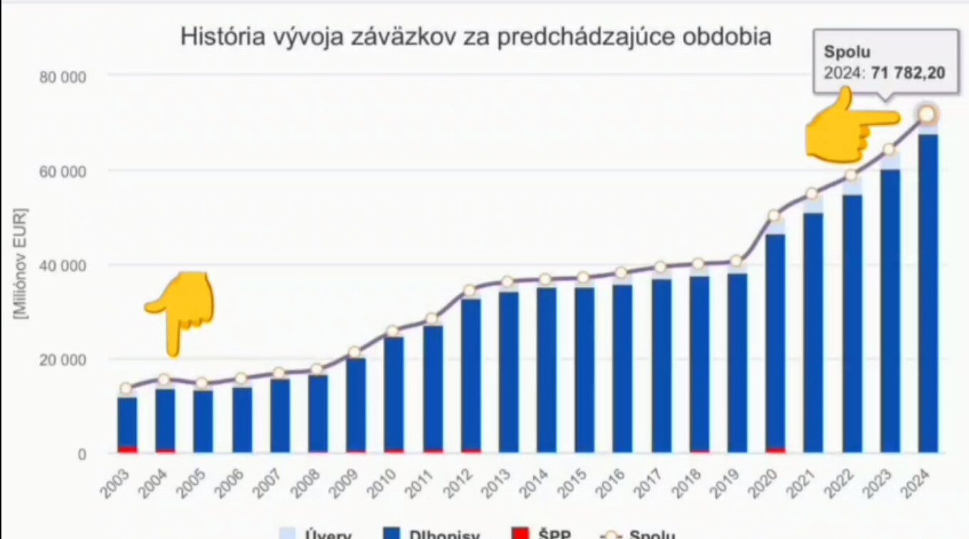Vstúpili sme do EU v roku 2004 pri dlhu 20 miliárd eur a v roku 2024 máme dlh takmer 80 miliárd eur; po 20 ročnej „ekonomickej pomoci“ západu a po tom, ako nám „pomohli“ postaviť sa na vlastné nohy.