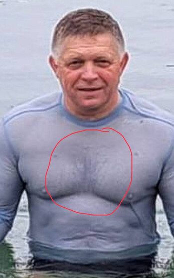 A odvtedy Ficov hrudník nikto nevidel. Fico sa kúpe v podivných tričkách, aby ľudia nevideli jazvy po podívnej operácii srdca a po podivnom atentáte.