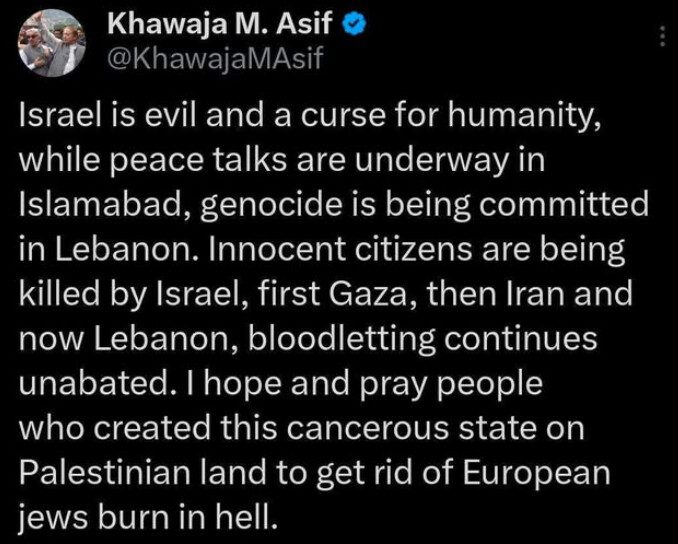 Pakistanský minister obrany Khawaja Asif zverejnil na X/Twitteri vyhlásenie, ktoré už bolo zmazané, v ktorom nazval Izrael „zlom“, „rakovinovým nádorom“ a „prekliatím pre ľudstvo“, pričom vyjadril nádej, že tí, ktorí tento štát založili, „zhoria v pekle“.