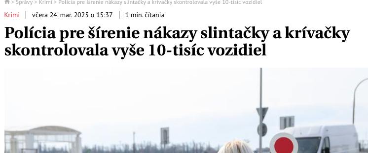 🗣„Povinná je dezinfekce lidí, kteří přišli do kontaktu s hospodářskými zvířaty, a také vozidel, jež přepravovala vnímavá zvířata. Dezinfikována jsou také všechna vozidla, která projíždějí přes jednu ze slovenských vesnic, kde byla slintavka a kulhavka potvrzena a kde začalo utrácení skotu. Ve dvou okresech na jihu Slovenska je zakázán vstup veřejnosti do lesů.“