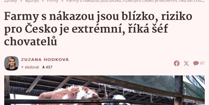 🗣„Utracena budou i vůči nákaze vnímavá zvířata ve tříkilometrovém okruhu od míst nákazy; slintavka a kulhavka kromě skotu ohrožuje například kozy, ovce, prasata a také některá volně žijící zvířata.“