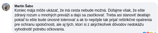Myslím, že s dostatkom vakcín už nastal čas, aby sme reštrikčné opatrenia už nariaďovali podľa toho, či je človek očkovaný alebo nie. Kampaň na podporu očkovania hlása, že očkovanie je sloboda, tak tento slogan skutočne naplňme! Ten, kto sa chce chrániť vakcínou, bude vakcínou chránený a lockdown nepotrebuje. Ten kto vakcínu odmieta, musí sa chrániť lockdownovými opatreniami, karanténou a testovaním.