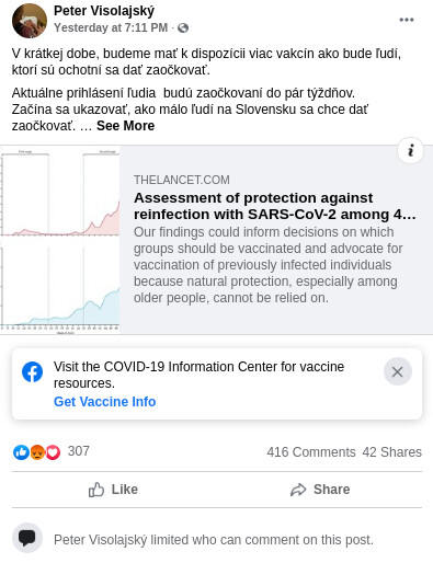 Aktuálne Visolajský na svojom FB upozorňuje, že Slováci sa nechcú očkovať a treba ich obmedzovať na slobode…aby sa dali.