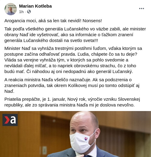 Minister Naď sa vyhráža trestnými postihmi ľuďom, vďaka ktorým sa postupne začína odhaľovať pravda. Ľudia, chápete čo sa tu deje? Vláda sa verejne vyhráža tým, v ktorých sa pohlo svedomie a nevládali ďalej mlčať, a to napriek obrovskému strachu, čo z toho budú mať. Či náhodou aj oni nedopadnú ako generál Lučanský.