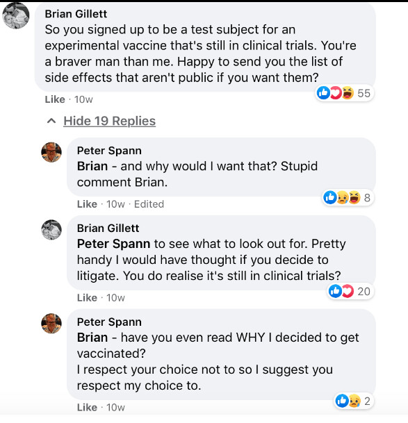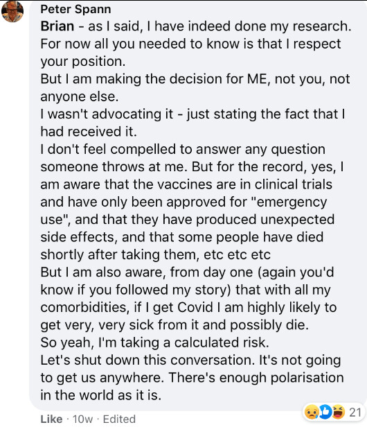 V tomto príspevku zosnulý píše, že vie o tom, že vakcína je v klinickom testovaní, že je len na núdzové použitie, že má množstvo vedľajšich účinkov vrátane úmrtia. Ale rozhodol sa zaočkovať, lebo si myslí, že ak by dostal Covid-19 tak zomrie.