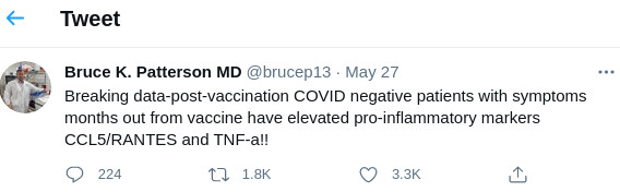 Pacienti očkovaní vakcínou na COVID-19 majú mesiace po očkovaní príznaky, napriek tomu, že sú COVID negatívni. Majú zvýšené zápalové markery CCL5/RANTES a TNF-alfa.