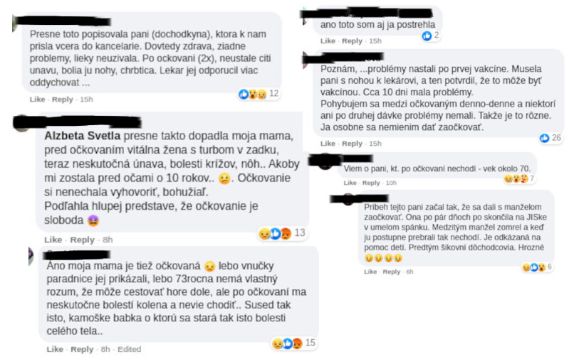 Mám viacero známych vo svojom okolí, ktorých blízki sa očkovali a majú bolesti nôh. To predtým nikdy nemali, ide o osoby vo vyššom veku. Niektoré majú pocit únavy, slabosť, ľahšia unaviteľnosť.