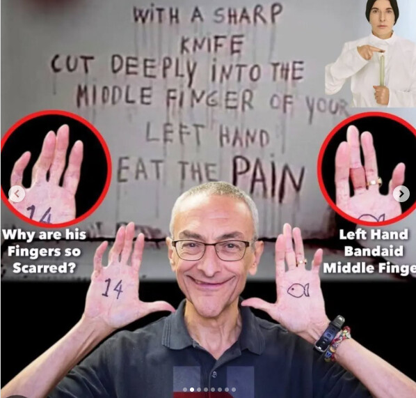 Pozrite sa na túto fotku. Podesta už od pohľadu vyzerá ako dokrivený krypeľ a nič dobré mu nejde z oči. Ma dokrivené prsty. (podľa google ide o konšpirácie, tak to berte s rezervou). Asi ešte treba počkať na tisice utajených Eppsteinovych správ, ktoré nechcú zverejniť.