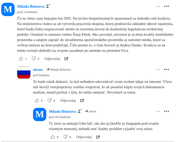 Milada Belasová zo SNS ako vzorná straníčka schváľuje kontrolu ľudí na internete. Chce, aby na internete mohli diskutovať len ľudia po preverení osobných údajov ako občianský preukaz a podobne. Čoskoro pribudnú podmienky ako očkovanie, ktor budú prepojené cez europskú digitálnu peňaženku. To sú „národovci“. Možno tak národa Izraelitov, ku ktorým sa utieka aj Danko..