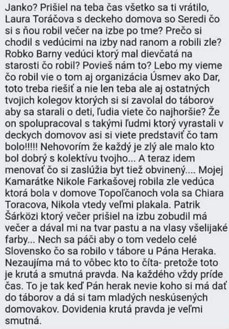 Práve medzi animátormi a organizátormi rôzných detských krúžkov je pomerne vysoký výskyt osôb, ktoré zneužívajú deti. Mnohí túto prácu vyhľadávajú cielene. Ako to bolo v prípade Heráka ukáže čas. Netreba však odsudzovať dieťa len za to, že je z domova a tým musí klamať…už toto vyjadrenie Heráka stojí za zamyslenie.