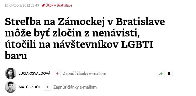 zdroj: https://dennikn.sk/3052652/strelba-na-zamockej-v-bratislave-moze-byt-zlocin-z-nenavisti-utocili-na-navstevnikov-lgbti-baru/
