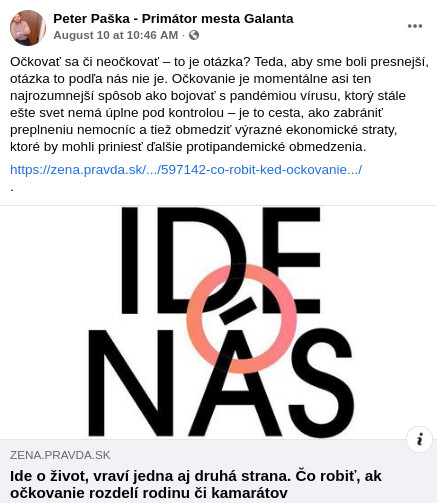 Primátorom Galanty je Peter Paška. Ten kandidoval s podporou strany SMER-SD. Napriek tomu, že SMER-SD sa tvári, že je proti diskriminácii a segregácii ľudí, tak Paška je vakcinačný fanatik.
