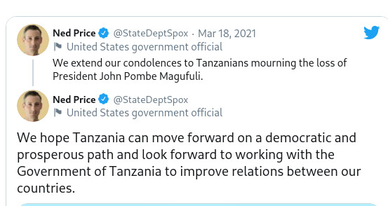Hneď po srmti Magufuliho sa vyjadril americký hovorca, že dúfa, že Tanzánia sa vyberie cestou demokracie a prosperity (totalita COVID opatrení a rozkrádanie farma lobby? – tým myslel tú demokraciu?)
