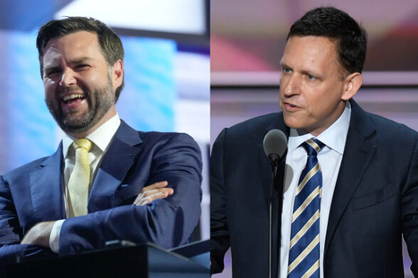 J.D. Vance naľavo, milovník detskej krvi Peter Thiel napravo