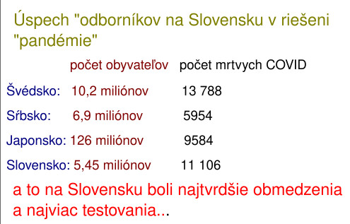 Pôvodným heslom zpred roka bolo: “ Z pandémie nás vyvedie testovanie a vakcinácia“. K tomu pridala prezidentka Čaputova a p. Remišová aj odbojne heslo “ vakcinácia=sloboda“. Na viac sa zrejme nezmohli. Prevencia, ambulatná sfra, „z prsta vytiahnutá“ intenzívna starostlivosť karpatských lekárov nikoho nezaujímala. Ministerstvo v rozklade, stávka na jednu kartu v podobe chimérickej vakciny ( o ktorej naozaj ešte netušíme, či je správnym riešenim) a plošného testovania ala Čekan priniesla svoje v podobe 11.000 mŕtvych len na Covid a permanentne nadmerne (all causes) úmrtia každý mesiac od septembra 2020 doteraz.