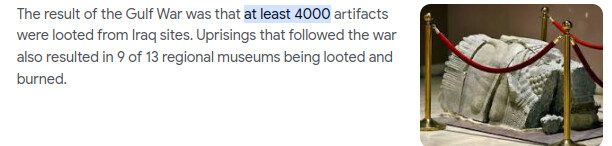 2. vojna v Perzskom zálive bola vedená štátmi OSN pod vedením USA proti Iraku. Výsledkom bolo ukradnutie vyše 4000 historických nálezov. Pričom správy hovoria o omnoho väčšom počte.