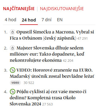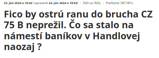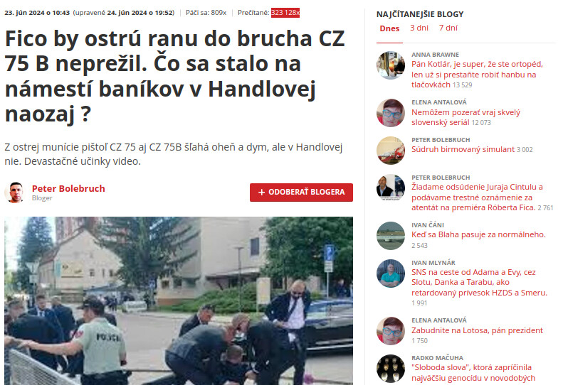 Dnes 24.6.2024 ukazovalo v najčítanejších blog o tom, že Ficov atentát je podvod a nestrieľalo sa ostrými. Článok ma dnes čítateľnosť vyše 100 000 čítaní. Ide o jednoznačne najčítanejší článok na sme.sk.