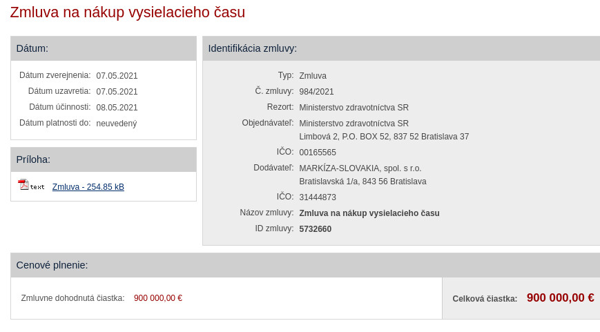 Zmluvu podpísal minister zdravotníctva. Kedže je nudzový stav, výberové konanie nebolo. To sa rozkradajú slovenské peniaze že?