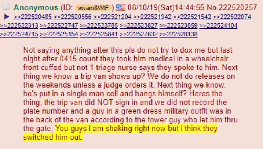 Teraz máme potvrdenie, že príspevok na 4Chan z 10. 8. 2019 je legitímnym svedectvom očitého svedka, väzenského dozorcu z MCC, že Epstein mohol byť vymenený skôr, ako sa objavili správy o jeho údajnej samovražde.