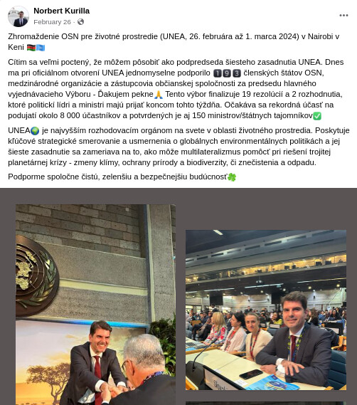 UNEA je program pod záštitou OSN, ktorý sa v roku 2024 konal v Keni. Slovensko zastupoval Norbert Kurilla ( poradca Čaputovej, nominant vlády SMER-SD, SNS, MOST-HÍD a je vo funkcií až doteraz). Takto vyškolené kádre sa nemenia, nech je vláda, akákoľvek.