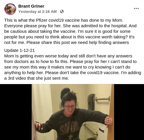 Syn matky, ktorá má závažné vedľajšie účinky po očkovani vakcínou na COVID píše na svojom facebooku. Toto je, čo urobila vakcína Pfizer mojej mame. Prosím všetkych, aby sa za ňu modlili. Bola prijatá do nemocnice. Buďte opatrni, ak si chcete dať pichnuť vakcínu. Som si istý, že je dobrá pre niektorych ľudi, musite si premyslieť, či stoji za to si ju dať pichnúť. Vakcína nie je pre mňa. Prosím vás o zdieľanie, chceme zistiť odpovede na naše otázky.