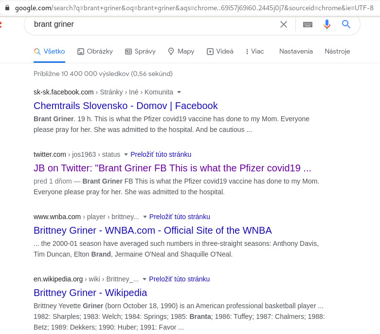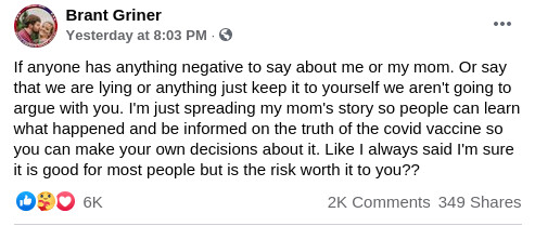 jej syn Brant Griner píše na faceboooku, že mu píšu ľudia, ktorí ich obviňujú z klamstva, útočia na nich. Píše, že nemá za potreby sa s nimi hádať. Píše, že len šíri to, čo sa stalo jeho mame a chce ľuďom ukázať pravdu o COVID vakcíne, aby sa ľudia rozhodli správne.