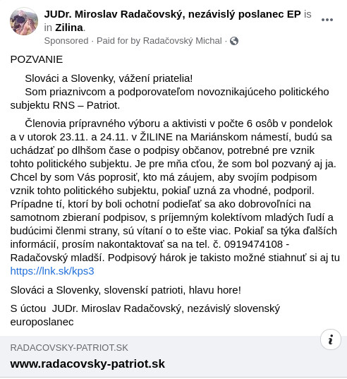 17.1.2024 https://www.hlavnespravy.sk/radacovsky-ak-neprestaneme-moze-sa-stat-ze-my-slovania-sa-spojime-a-zo-zapadnej-europy-urobime-travnik/3375900 Radačovského aktivity v europarlamente sú mizerné. Radačovský podporuje experimentálne očkovanie na COVID-19: https://www.inenoviny.sk/riadena-opozicia-propaguje-gmo-geneticku-vakcinu/ …