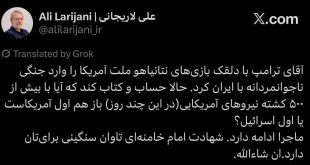 Tajomník Najvyššej národnej bezpečnostnej rady Iránu Ali Larijani: V dôsledku Netanjahuovej bezohľadnosti a klaunovského správania Trump vtiahnul americký ľud do nespravodlivej vojny s Iránom. Nech sa dnes spýta sám seba: po smrti viac ako 500 amerických vojakov za pár dní, platí ešte slogan „Amerika na prvom mieste“, alebo ho nahradil …