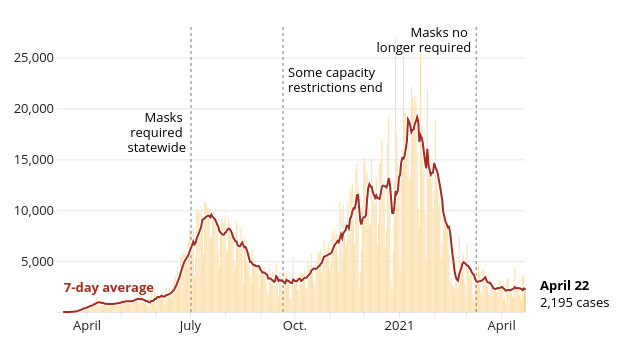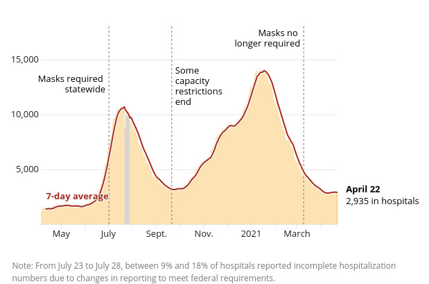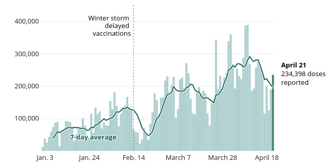 Počet zaočkovaných v Texase je 21%, čo vychádza 1 z 5 obyvateľov Texasu. Počet hospitalizovaných sa nemení a je to malé číšlo – 2935. Denne pribúda cca 2900 pozitívnych na COVID-19.