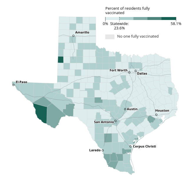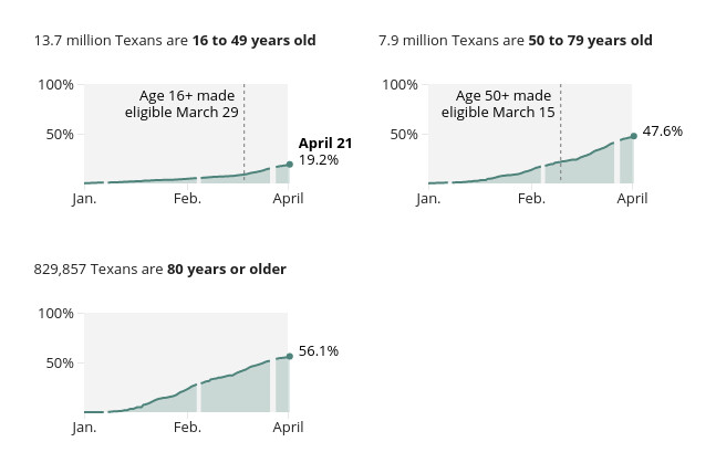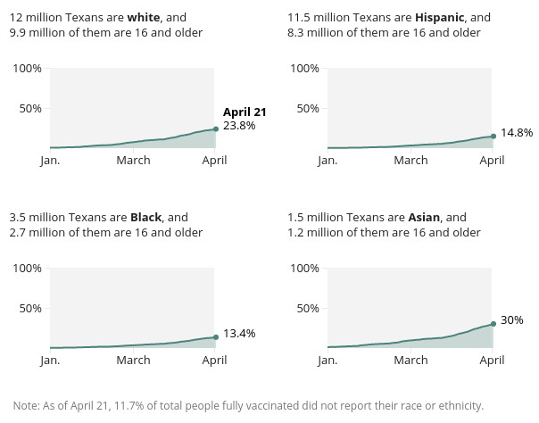 V Texase sa očkuje od veku 16 rokov. Guvernér Greg Abbott zakázal vyžadovať pre vstup do inštitúci a organizáci potvrdenie o očkovani. Farma lobisti a osoby napojené na farmaceutický kartel strašia občanov a vyžadujú očkovanie aj nosenie masiek. Guvernér zrušil povinnosť nosiť masky v marci, otvoril biznis naplno. Odvtedy nepribúdajú úmrtia ani počet hospitalizovaných.