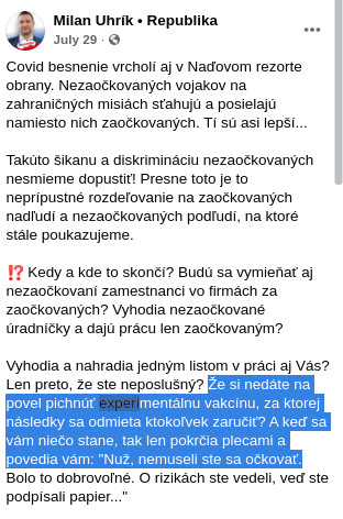 Toto sa len ťažko vymyslí. Predseda hnutia Republika – Milan Uhrík je proti očkovaniu na COVID-19, odmieta ho a označuje ako experimentálne s neznámymi následkami o pár rokov.