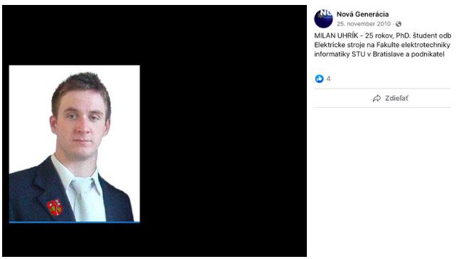 Na facebookovej stránke Novej Generácie ešte aj dnes možno nájsť Uhríkovu fotografiu, zverejnenú v novembri 2010, s jednoduchým popisom „Milan Uhrík – 25 rokov, PhD. študent odboru Elektrické stroje na Fakulte elektrotechniky a informatiky STU v Bratislave a podnikateľ“.