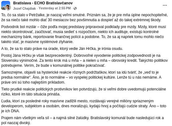 Až o 2,7 milióna eur mal podvodným spôsobom pripraviť dnes už bývalý zamestnanec bratislavskú mestskú časť Petržalka. Starosta Ján Hrčka vyjadril počudovanie, ako niekto vytiahol z mestskej časti toľko peňazí a nikto si to nevšimol.