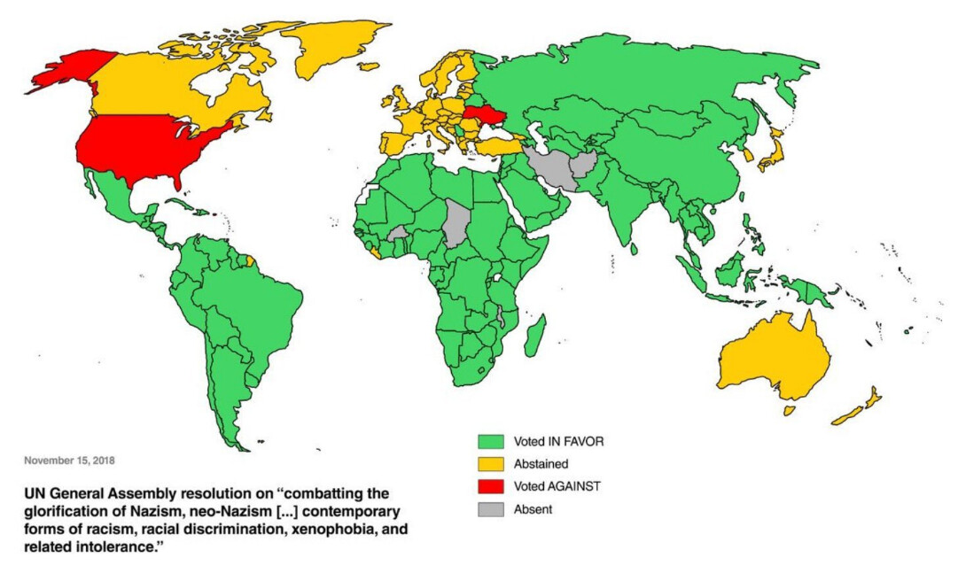 Rusko už dlho odsudzovalo Ukrajinu a pobaltské štáty za to, že umožňujú glorifikáciu nacizmu, zatiaľ čo USA tvrdili, že ide o ruskú dezinformačnú kampaň propagovanú rezolúciou. USA pritom museli vedieť, aký je vývoj vo svete čo sa týka vzostupu neonacizmu. Proti rezolúcii hlasovali preto, lebo návrh podalo Rusko a potom preto, lebo USA dlhodobo podporovali naonacistické sily na Ukrajine z dôvodu presadzovania svojich agresívnych plánov proti Rusku.
