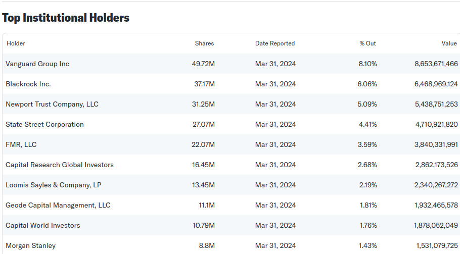 Ako inak, najväčšími akcionármi sú firmy spájané s Rothschildovcami a inými bankárskymi dynastiami zlosynov: Vanguard, Blackrock.