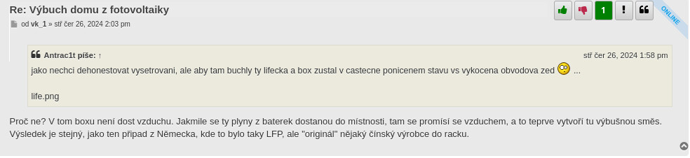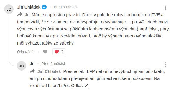 V diskusiach nájdete nezmysly, že LIFEPO4 batérie používané v domoch nevybuchujú alebo nehoria. To je samozrejme hluposť, nevedomosť alebo biznis. Ak niekto zarába na montáži fotovoltaiky, tak to bude propagovať cez mŕtvoly. LiFEPO4 horia a vybuchujú aj domy, kde to je.