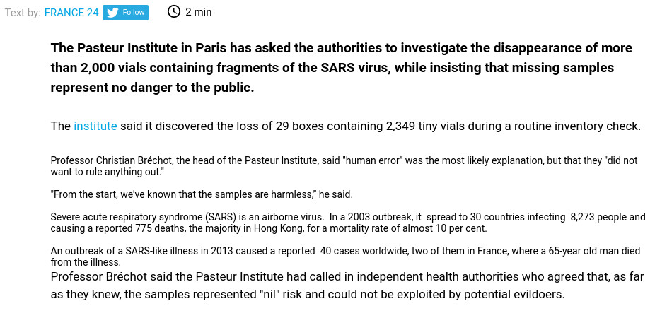 Pasteurov inštitút v Paríži požiadal v roku 2014 kompetentné orgány o vyšetrovanie zmiznutých 2439 ampuliek (skúmavie), ktoré obsahovali rôzne časti smrteľného SARS vírusu.