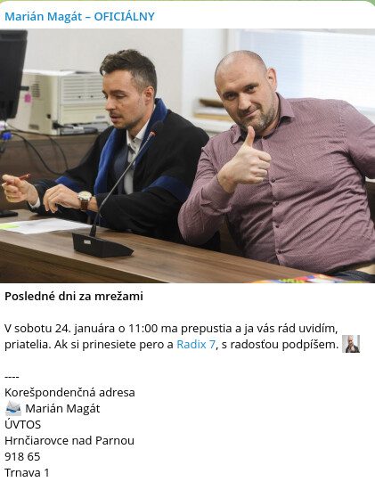 Aktuálne vďaka zákonom Ficovej vlády a Harabína – extremistické zákony – sedí 4 roky za napísanie knihy Marián Magát. Ten má byť prepustený 24.1.2026 z väznice Hrnčiarovce nad Parnou o 11:00, kde sa organizuje stretnutie jeho obdivovateľov.