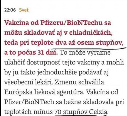 S vakcínou Pfizer sa stala nejaká podivná zmena, zrazu ju už netreba skladovať pri -70st.C, ale stačí obyčajná chladnička. Vysvetliť sa to nedá. Muselo dôjsť k pridaniu nejakej látky, ktorá stabilizuje celú vakcínu a tým pádom by mala takto modifikovaná vakcína podstupovať nanovo klinické testovanie.