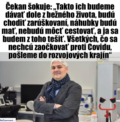 „Presne takto postupne ich budeme dávať dole z bežného života, jednoducho budú chodiť zarúškovaní, náhubky budú mať, nebudú môcť cestovať, a ja sa budem z toho tešiť… Všetkých, čo sa nechcú dať zaočkovať (proti Covidu) pošleme do rozvojových krajín“. Takto sa vyjadril vedec Čekan v „diskusii odborníkov o koronavíruse“ o ľuďoch s iným názorom, resp. o ľuďoch s prirodzenými obavami pred neoverenou vakcínou. A ostatní „odborníci“ sa smejú, ako pekne rozpráva…