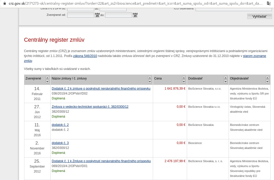 https://crz.gov.sk/2171273-sk/centralny-register-zmluv/?order=22&art_zs2=bioscience&art_predmet=&art_ico=&art_suma_spolu_od=&art_suma_spolu_do=&art_datum_zverejnene_od=&art_datum_zverejnene_do=&art_rezort=0&art_zs1=&nazov=&art_ico1=&search=