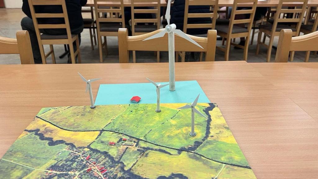 Upozornenie: Mapa použitá v tomto modeli je len orientačná a nezodpovedá mierke reálneho územia. Hoci výšky turbín boli zachované v správnom pomere, veľkosť krajiny je opticky zmenšená, čo môže pôsobiť dojmom, že turbíny sú ešte bližšie a masívnejšie. To však nič nemení na fakte, že podobne vysoké turbíny môžu stáť aj u nás.
