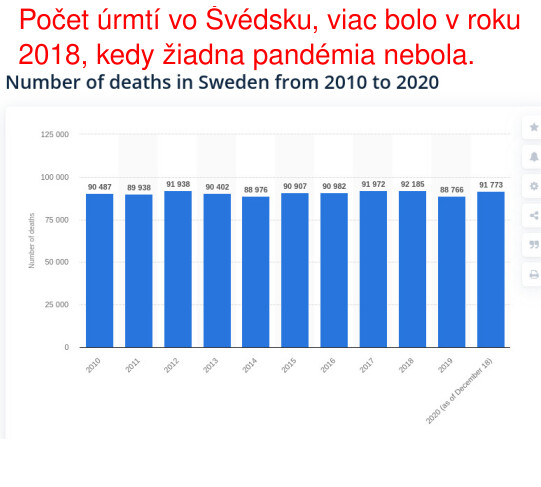 Keď je pandémia, tak je množstvo zomretých, ktoré na každom grafe si všimnete. Ak si pozriete Švédsko tak počet úmrtí v roku 2020 je nižší ako v 2018, kedy žiadna pandémia nebola. Oproti minulým rokom nie je žiadný významný nárast, napriek masívnej imigrácii (prišlo množstvo ľudi do Švédska – mal by stúpnuť prirorodzene aj počet úmrtií), to sa však nedialo. Navyše populácia starne, máme množstvo ľudí vo vyššom veku, čo sa prejaví v blízkej dobe nárastom úmrtí, bez toho, aby za to mohol nejaký vírus. Vysoké úmrtia boli v roku 2012, v 2009 bola prasacia chrípka a ľudia sa dali očkovať. Švedsko patrilo medzi štáty, kde sa najviac očkovalo proti prasacej chrípke – z grafov vidieť, že viac ľudi zomrelo po očkovani, ako počas „pandémie“ prasacej chrípky.